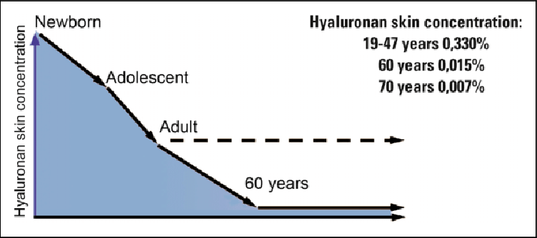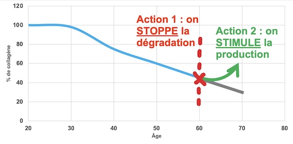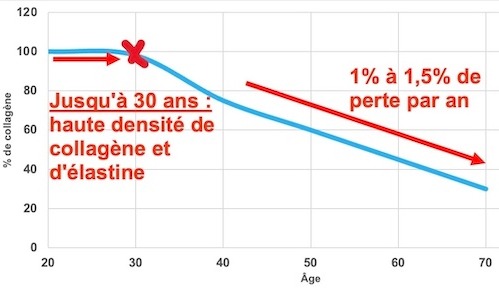 On voit sur le graphique que jusqu’à l’âge de 30 ans, la production de collagène est stable[1].