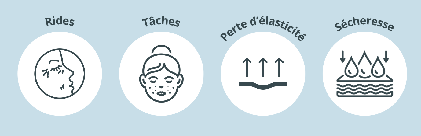 Et c’est la raison pour laquelle notre peau perd en souplesse, en élasticité, en fermeté… et que des rides et des tâches apparaissent.