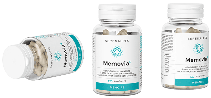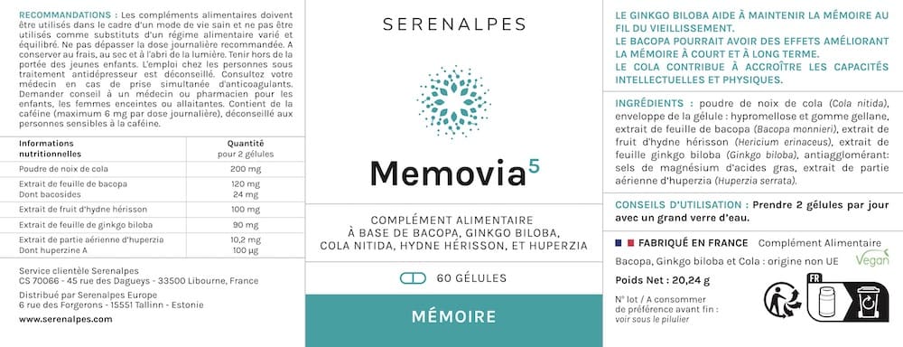 Memovia 5 est un complément alimentaire à base de bacopa, gingko biloba, cola nitida, hydne hérisson et huperzia. Il a été conçu par l’équipe R&D de Serenalpes et fabriqué en France.