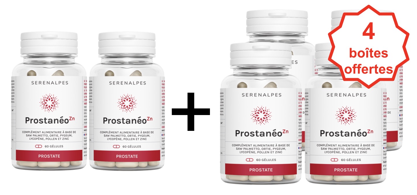 Prostanéo Zn est un complément alimentaire à base de Saw palmetto, pollen, ortie, Pygeum africanum, lycopène et zinc. Il a été conçu par l’équipe R&D de Serenalpes et fabriqué en France.