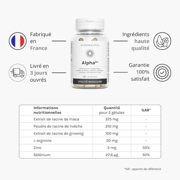 Alpha 6x est un produit d’origine naturelle, il fait effet sur le long terme. C’est pourquoi nous vous conseillons une cure de 3 ou 6 mois pour commencer.