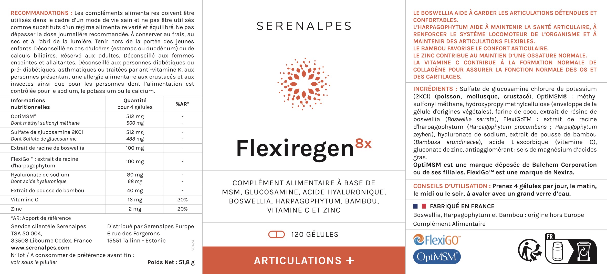 OptiMSM® : méthyl sulfonyl méthane, sulfate de glucosamine chlorure de potassium (2KCl) (poisson, mollusque, crustacé), enveloppe de la gélule : hydroxypropylméthylcellulose, farine de coco, poudre de résine de boswellia (Boswellia serrata), FlexiGoTM : extrait de racine d’harpagophytum (Harpagophytum procumbens ; Harpagophytum zeyheri), hyaluronate de sodium, extrait de pousse de bambou (Bambusa arundinacea), gluconate de zinc, acide L-ascorbique (vitamine C), antiagglomérant : sels de magnésium d’acides gras.