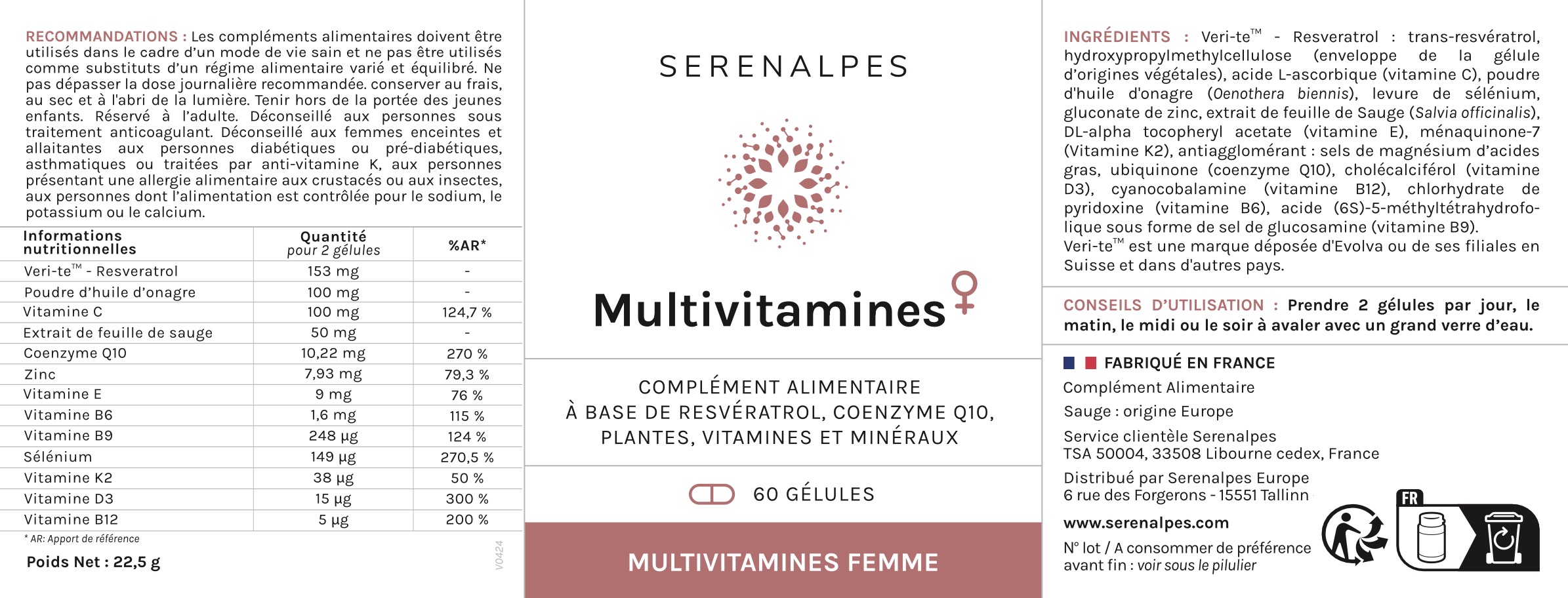 Veri-teTM – Resveratrol : trans-resvératrol, enveloppe de la gélule : hydroxypropylmethylcellulose, acide L-ascorbique (vitamine C), poudre d’huile d’onagre (Oenothera biennis), levure de sélénium, gluconate de zinc, extrait de feuille de Sauge (Salvia officinalis), DL-alpha tocopheryl acetate (vitamine E), ménaquinone-7 (Vitamine K2), antiagglomérant : sels de magnésium d’acides gras, ubiquinone (coenzyme Q10), cholécalciférol (vitamine D3), cyanocobalamine (vitamine B12), chlorhydrate de pyridoxine (vitamine B6), acide (6S)-5-méthyltétrahydrofolique sous forme de sel de glucosamine (vitamine B9).